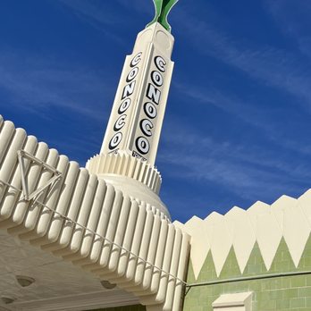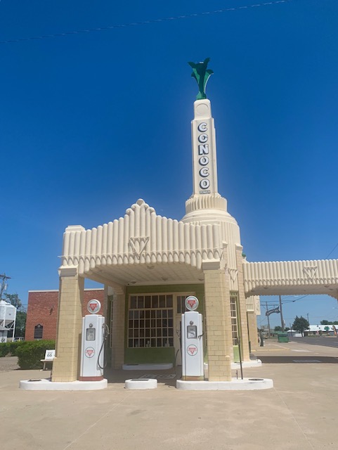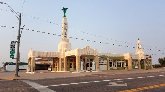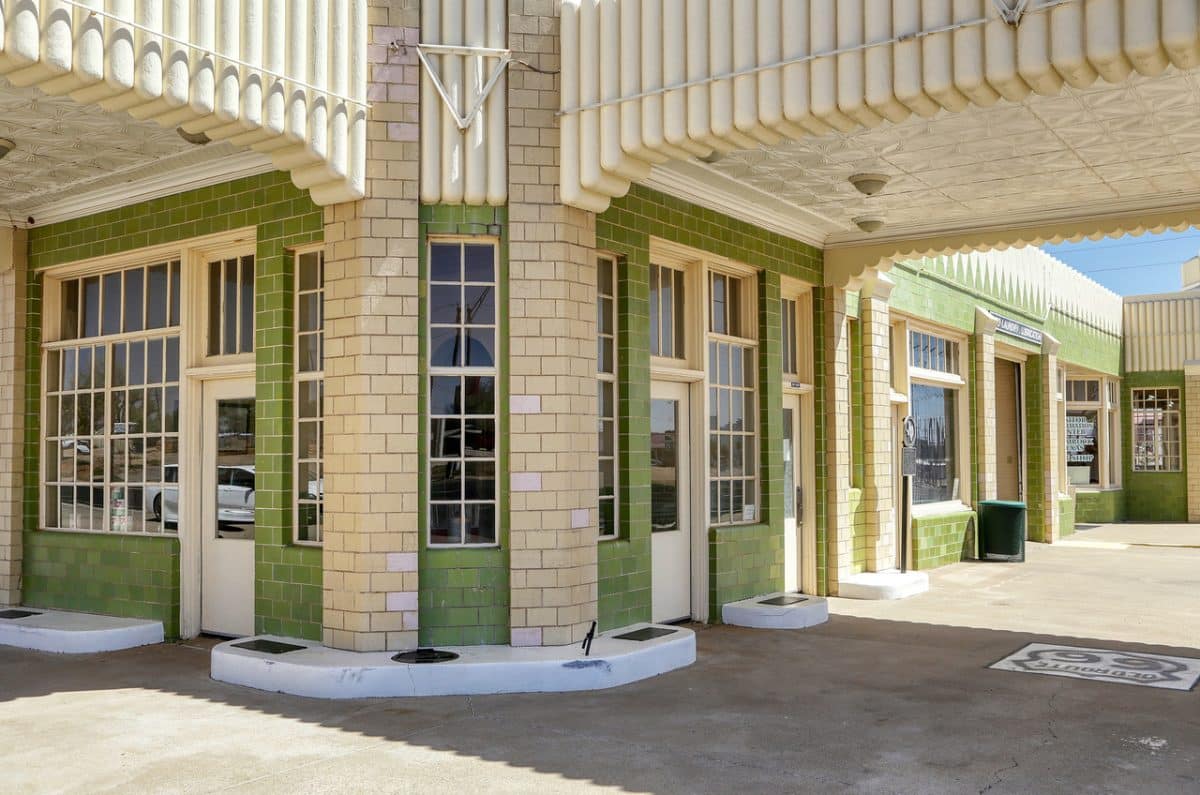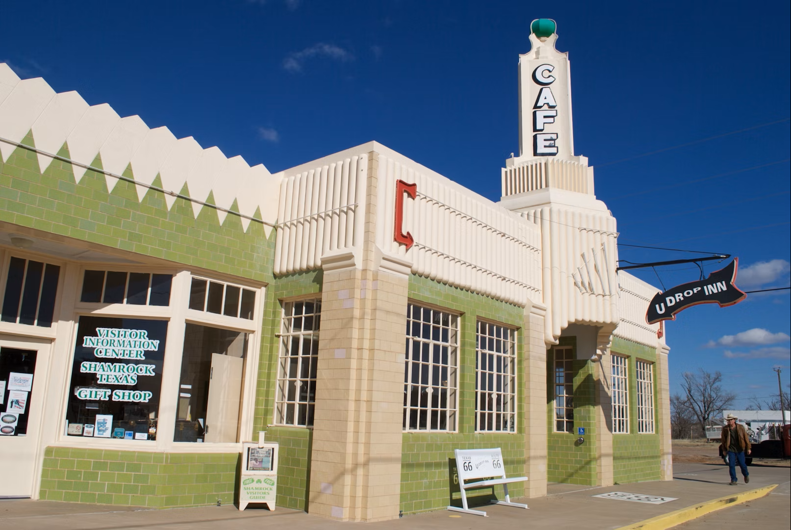 The historic Tower Station and U-Drop Inn Café was built in 1936 to serve travelers along Route 66. The location of U.S. Highway 66 made the main avenue of Shamrock boom with garages, filling stations, restaurants, and tourist courts. The Conoco station provided fuel for those early travelers, while the adjacent cafe provided food and drink. The third area was envisioned as a retail store, but became an overflow seating area for the cafe. Restored in 2004, today the iconic art deco building of green glazed tile and brick serves as a Visitor Information Center and also houses the Chamber of Commerce and in 2021 they began offering restaurant service in the building for the first time in decades. The center has an expanded gift shop and offers free coffee & tea along with free internet and encourages everyone to “sit a spell” and enjoy the ambiance of this historic icon along the “Mother Road”.