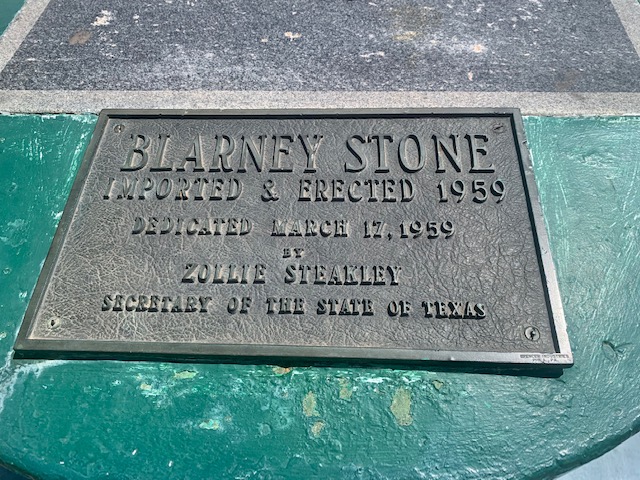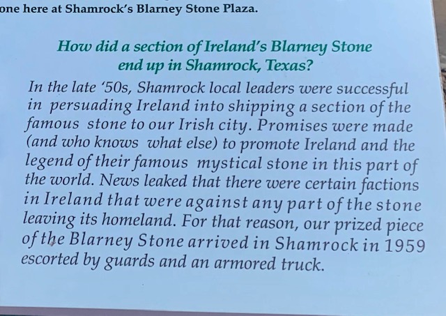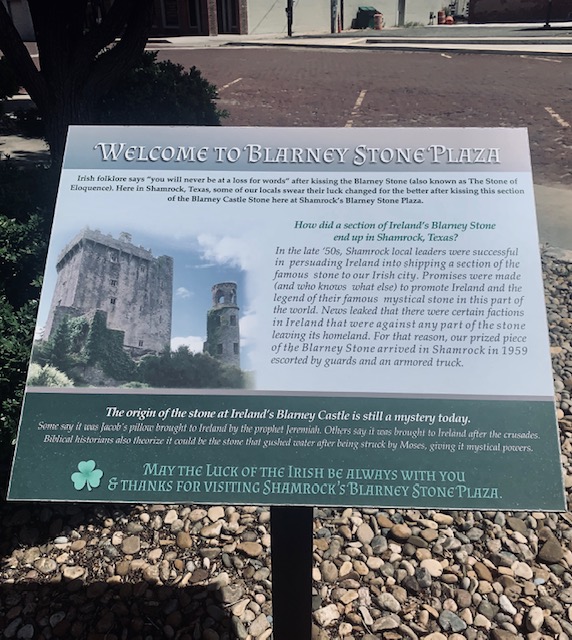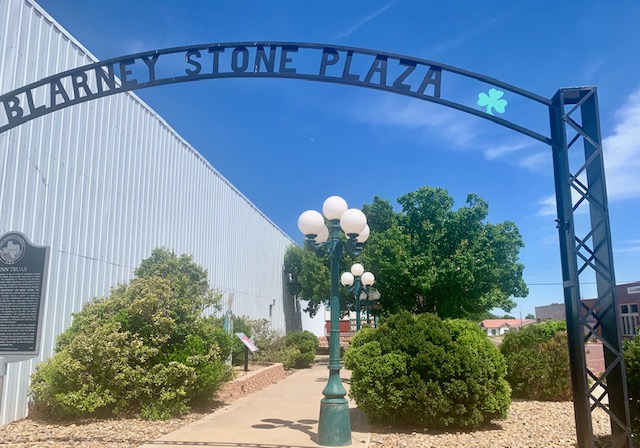 A fragment of the original Blarney Stone is immured within a concrete monument at Blarney Stone Plaza on Main St. This genuine chunk from the ruins of Blarney Castle was accidentally knocked off of the original Stone — at least according to the Shamrock official who brought it here in 1959. The chunk’s arrival was so important that Shamrock’s mayor called out the Texas Highway Patrol and the Texas National Guard, who reportedly stationed a sub-machine gunner atop the drug store as the Stone was wheeled into town.