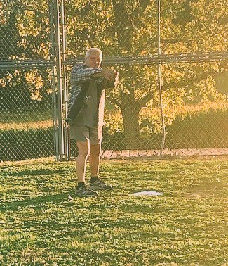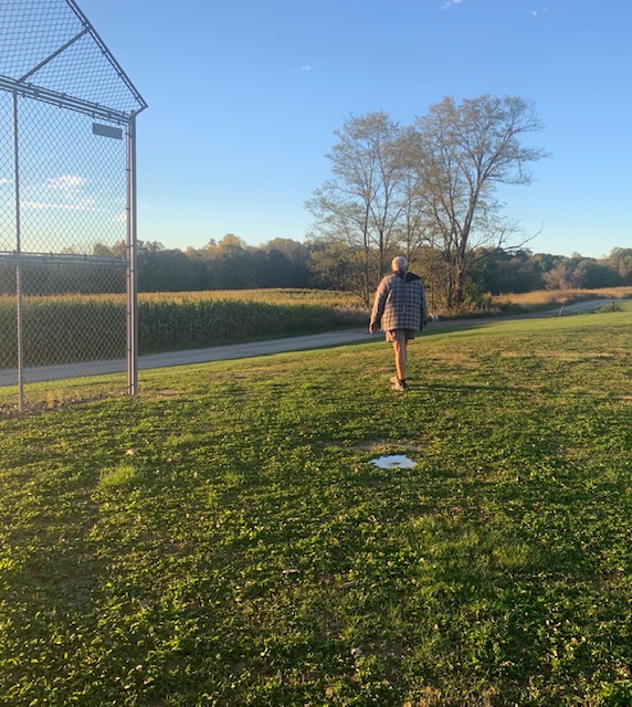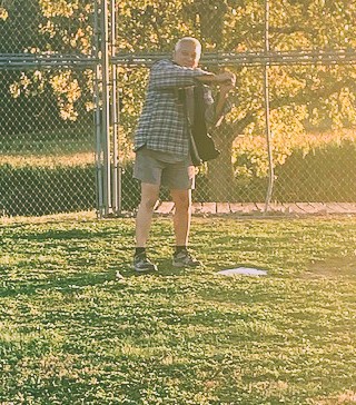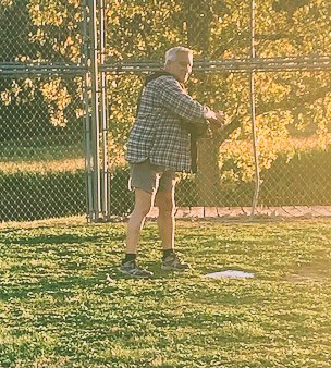 They have an old baseball diamond so I decided to pitch to Dave and he hit the ball back. Who needs a ball and a bat?