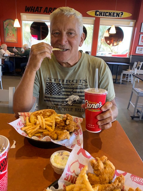 We got here about two weeks ago and have been laying low and just really not doing anything outside of the park, but one place we went was Cane’s cause we like their chicken, especially Dave. It was yummy!