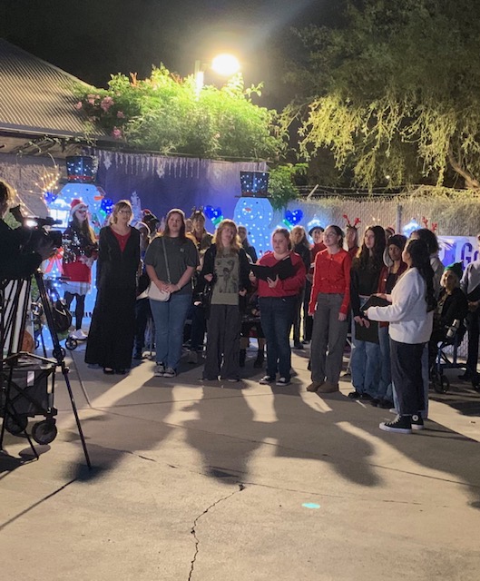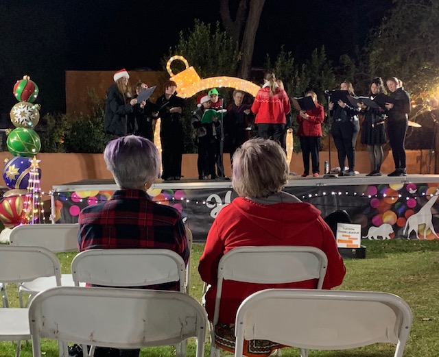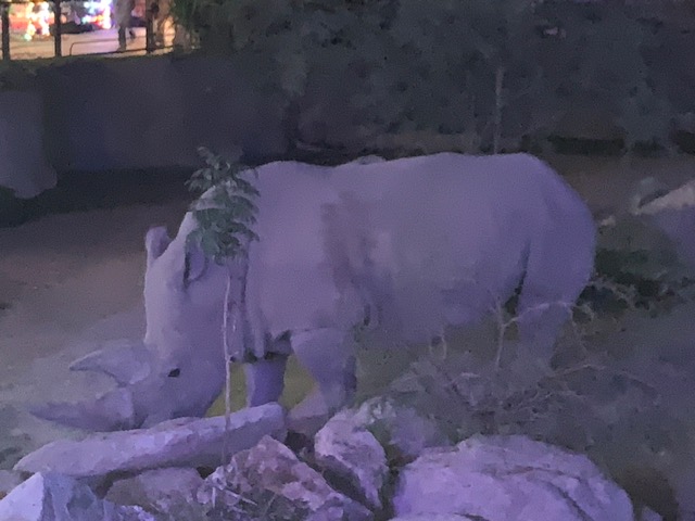 A Rhinoceros is still out and about in the dark. There was a choir singing Christmas Carols in the zoo.